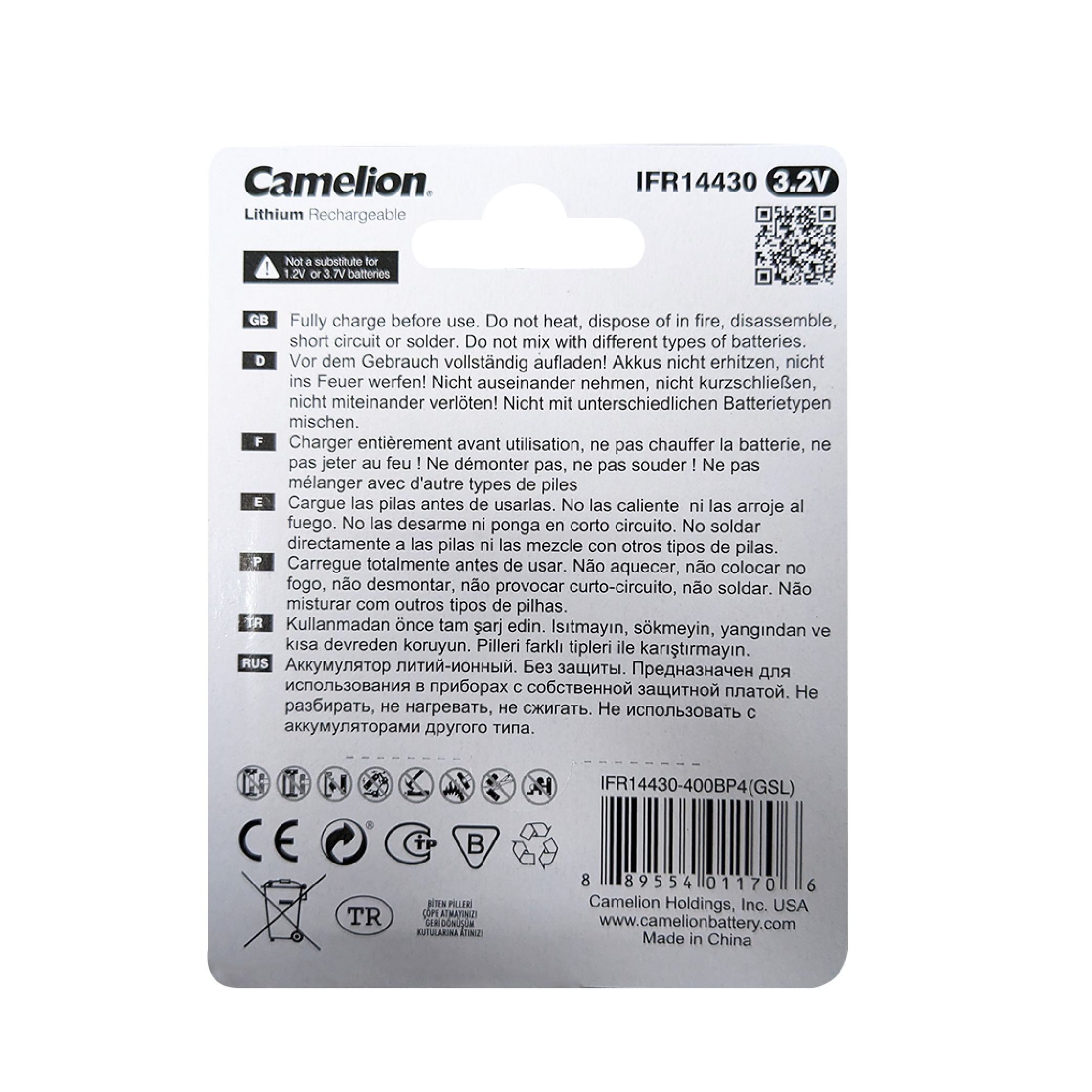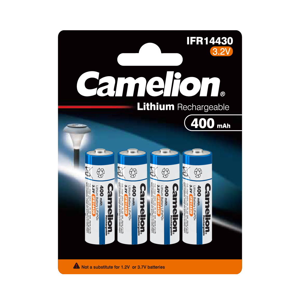 Camelion IFR14430 Lithium Iron Phosphate Rechargeable Battery 400mAh Blister Pack Of 4 - For Solar Lights