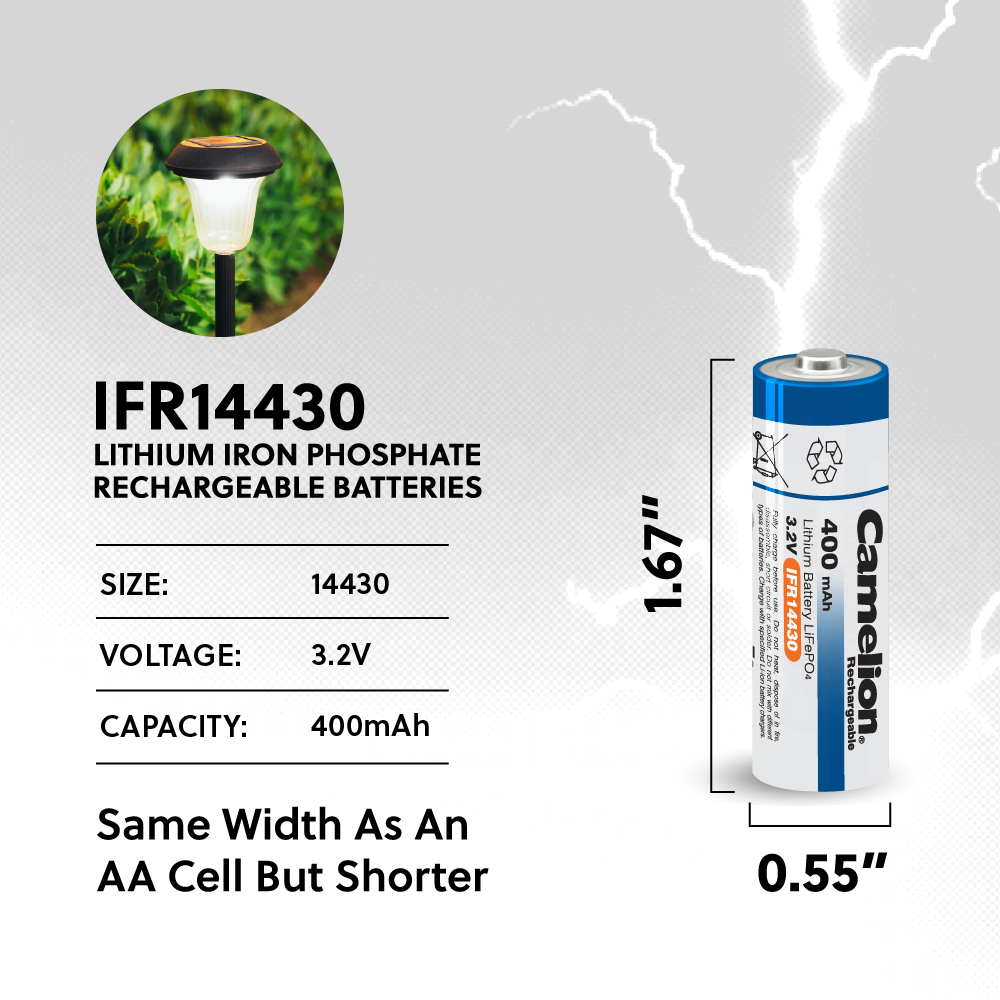 Camelion IFR14430 Lithium Iron Phosphate Rechargeable Battery 400mAh Blister Pack Of 4 - For Solar Lights Lithium-Iron Phosphate Batteries are... Read more